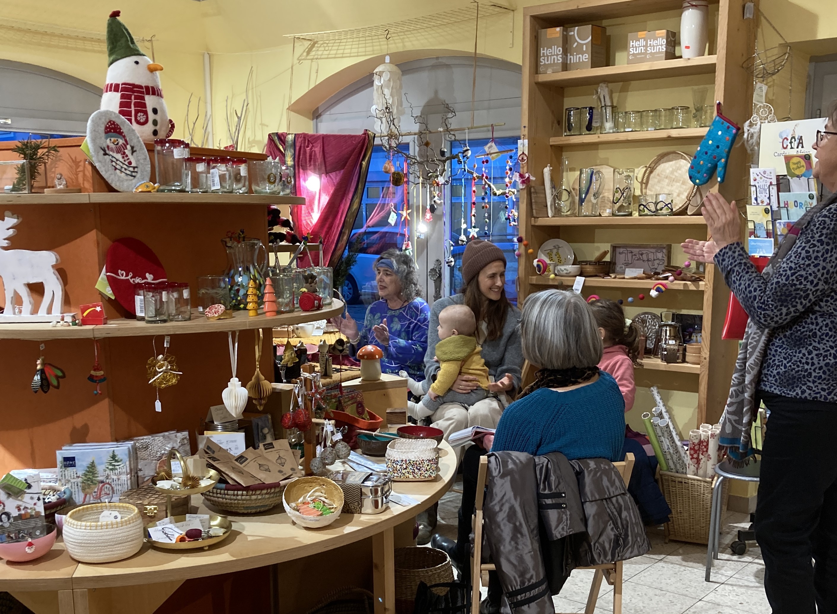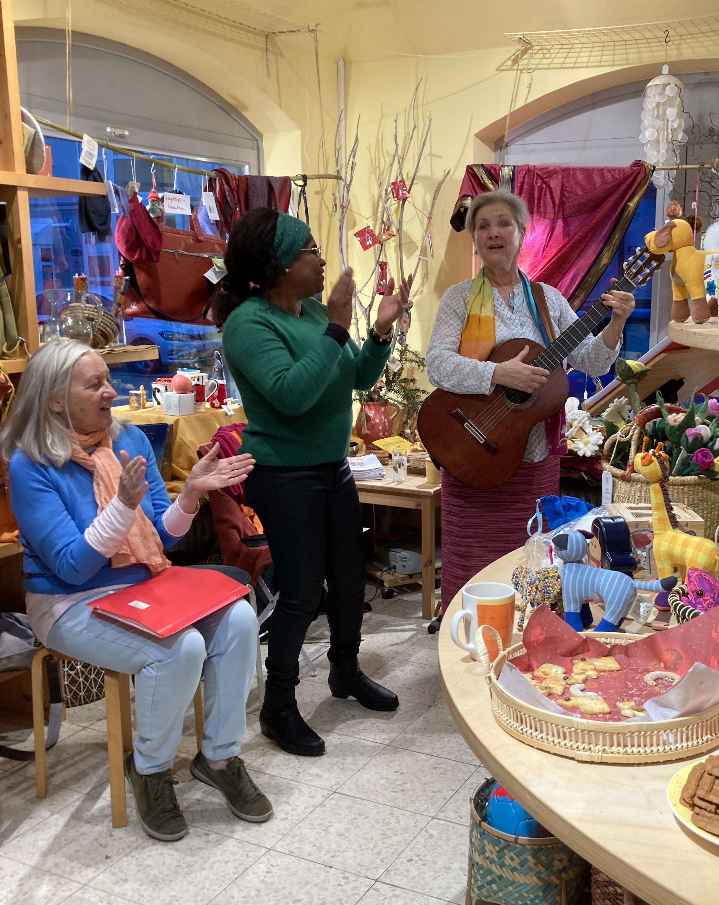 Festlich besinnliche Adventsstimmung kam am Nachmittag auf, als Mitglieder der EINE WELT - Inititative, WeltladenmitarbeiterInnen und Gäste gemeinsam mit Birgit Urban bei Fruchtpunsch und Adventsgebäck ausgiebig Advents- und Weihnachtslieder anstimmten.